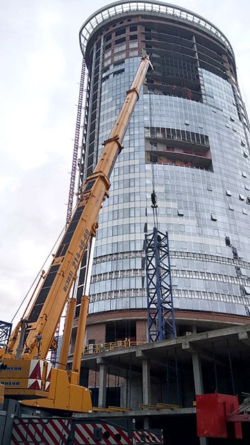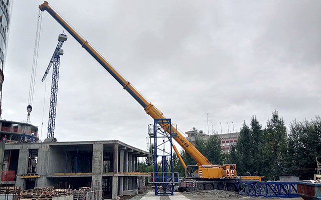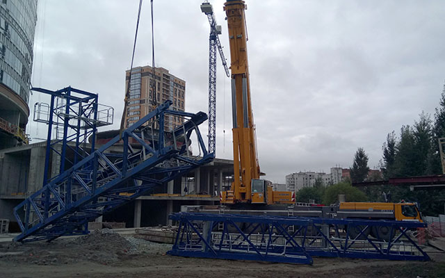 С помощью автомобильного крана Liebherr LTM 1400-7.1 грузоподъемностью 400 тонн был демонтирован башенный кран Comansa 10CJ140, участвовавший в строительстве 25-этажных домов ЖК «Флотилия» в Новосибирске.