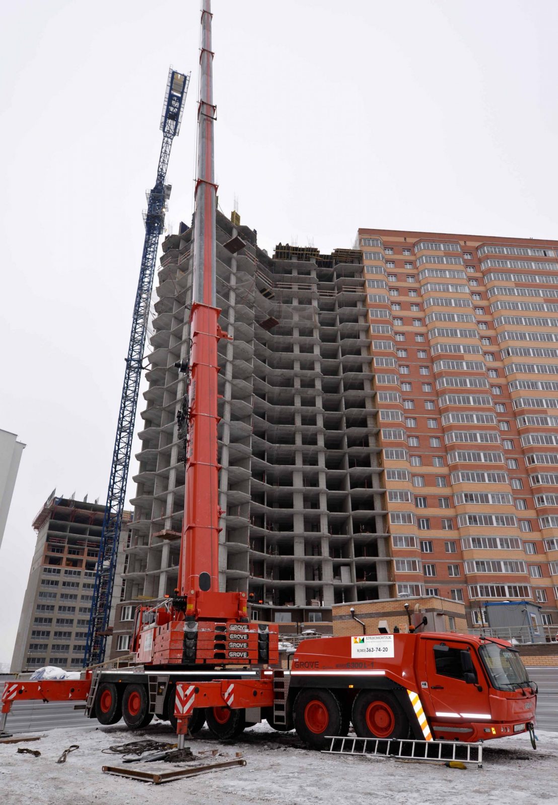 Монтаж осуществлялся с помощью автокрана грузоподъемностью 300 тонн GROVE GMK 6300L. Работа проходила в стесненных условиях стройплощадки, на высоте 96 метров.