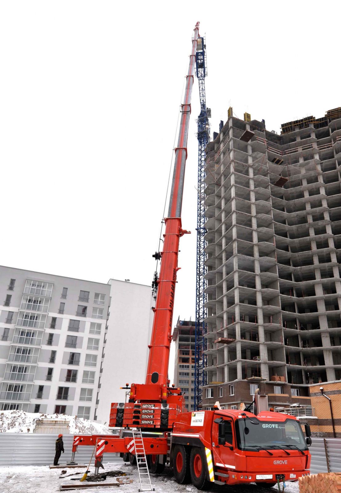При помощи автокран Grove GMK 6300L на высоте 96 м произведен монтаж крана Comansa
